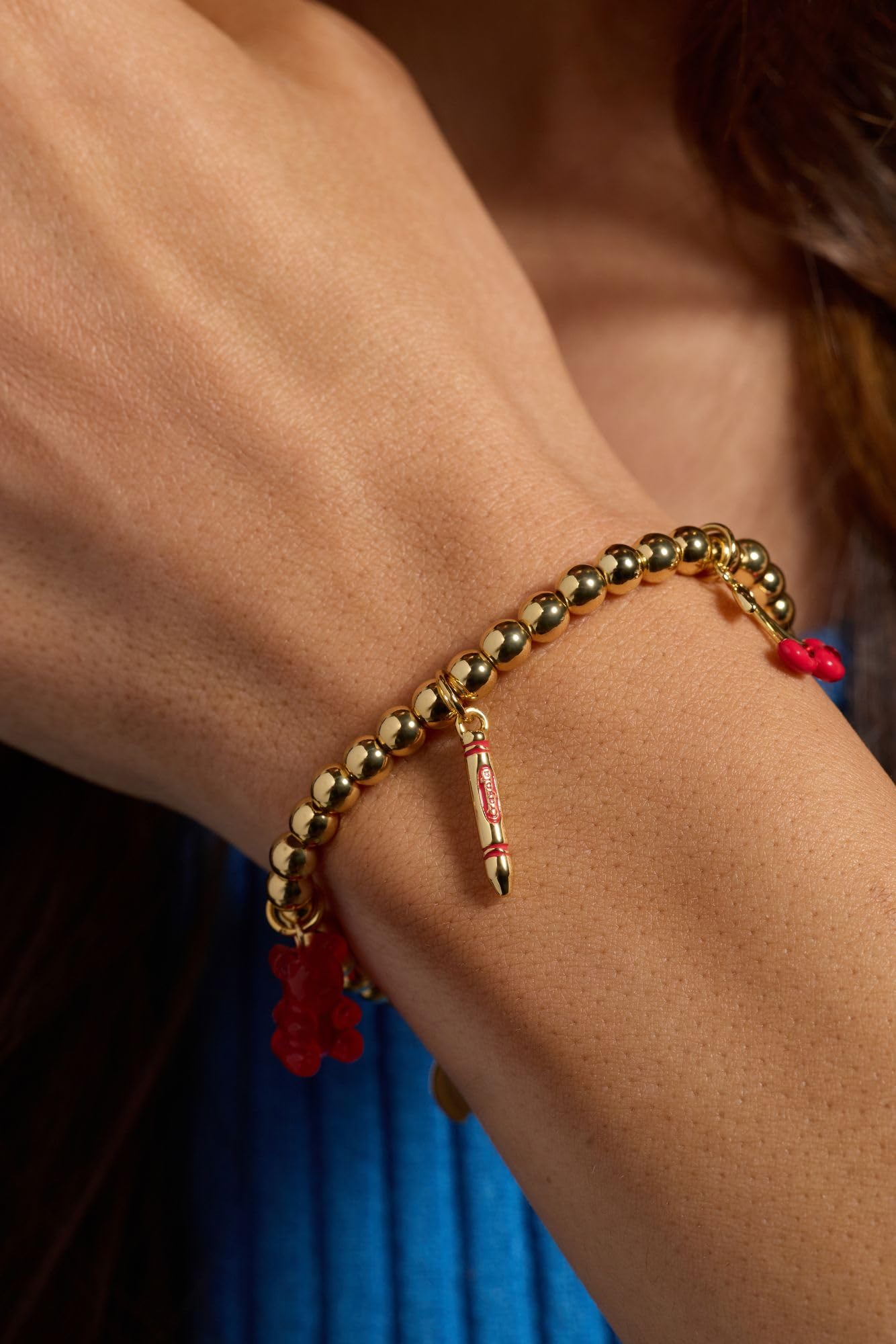 - SCARLET THEMED PLAYFUL CHARM DESIGN: Features five whimsical Scarlet-inspired charms including a resin gummy bear with siam stone accents, race car, cherries with sparkling details, crayon, and ladybug enamel charm.