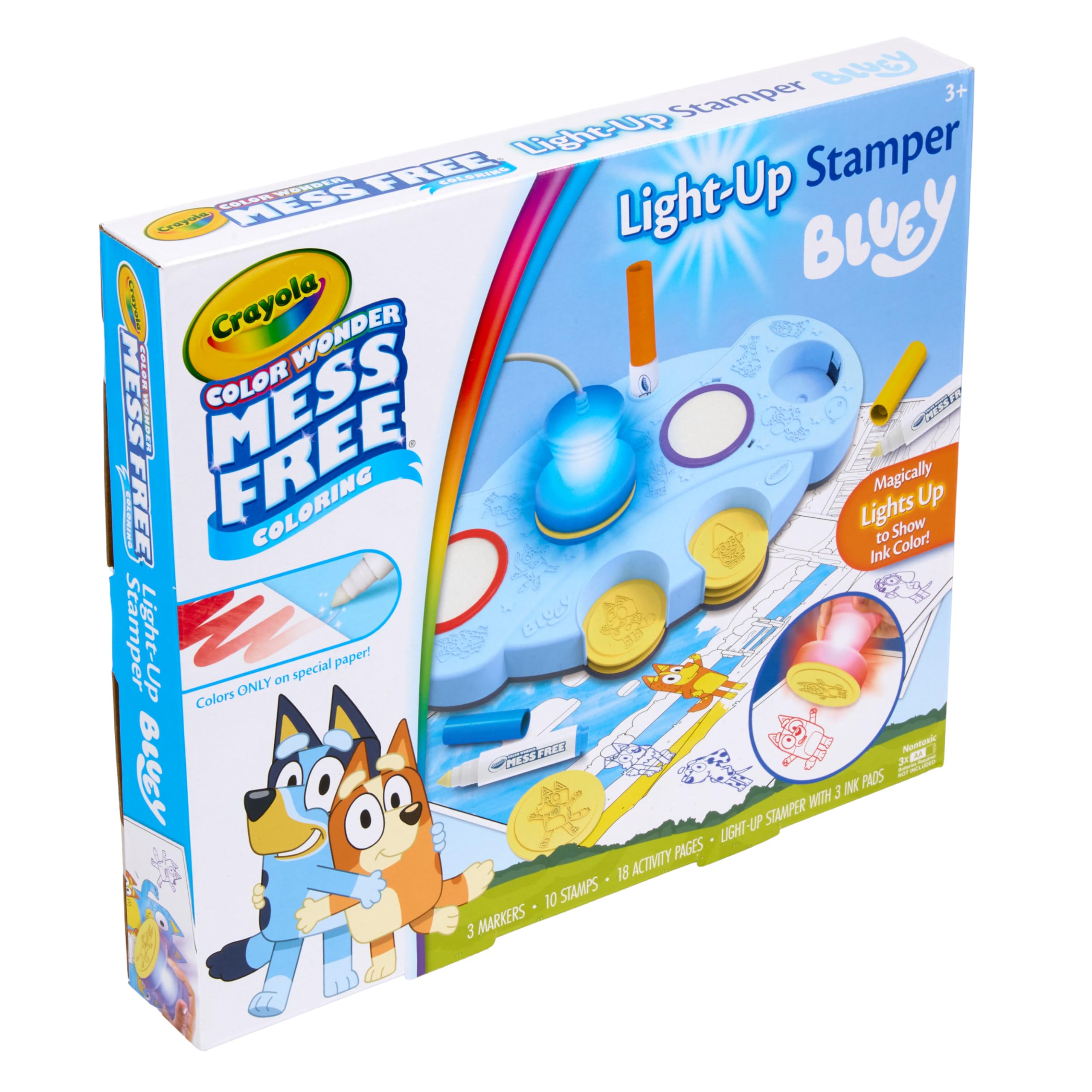 - COLOR WONDER STAMP SET: Includes a Bluey Branded Light-up Stamper Unit, 3 Vibrant Ink Pads, 18 Unique Coloring Activity Pages, 10 Bluey Character Stamps, and 3 Color Wonder Markers (3 AA Batteries required - not included).