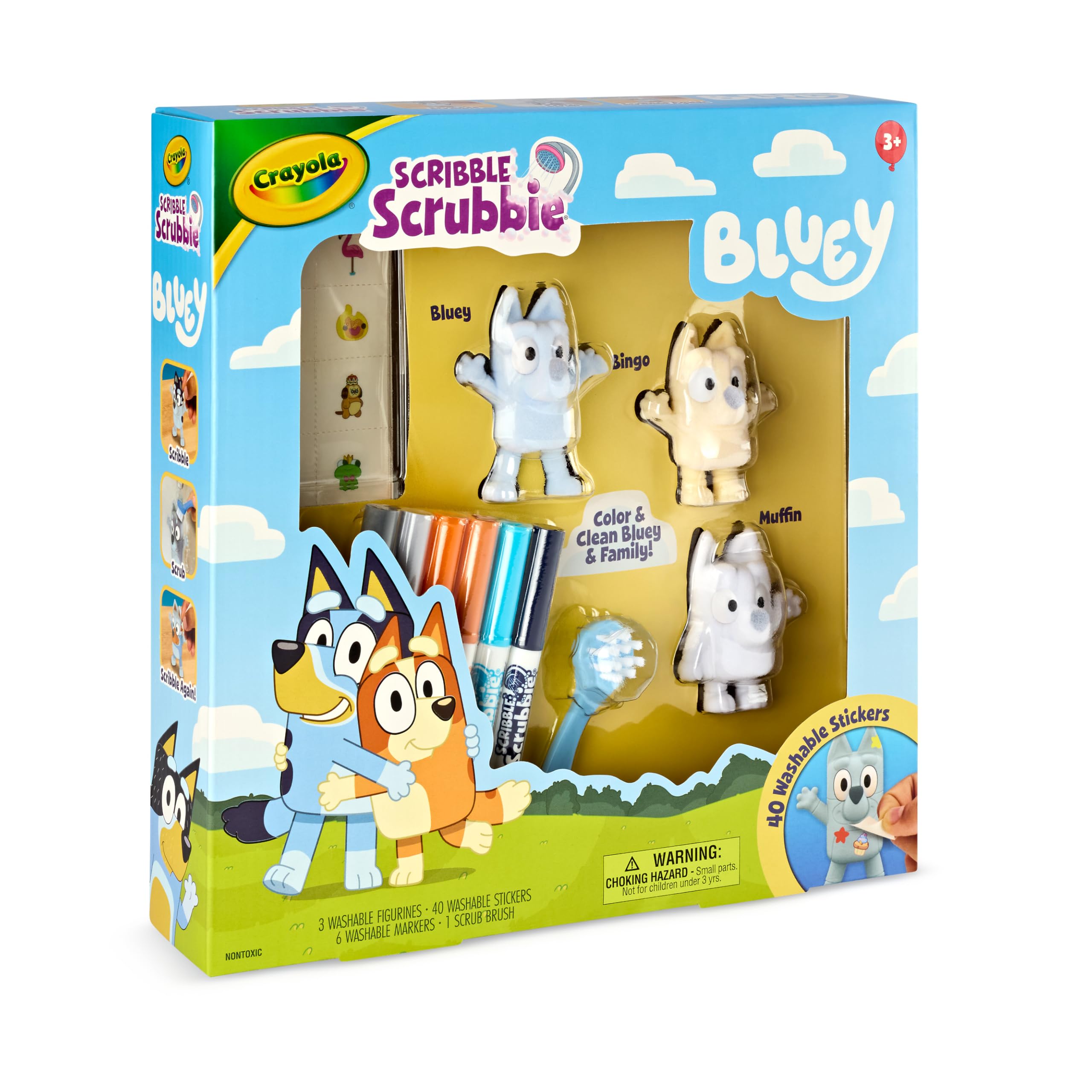 - SCRIBBLE SCRUBBIES BLUEY SET: Play with 3 new friends with this Scribble Scrubbie Deluxe Bluey Playset featuring 3 Bluey Characters, 40 Washable Character Stickers, 6 Washable Scribble Scrubbie Markers, & 1 Scrub Brush.